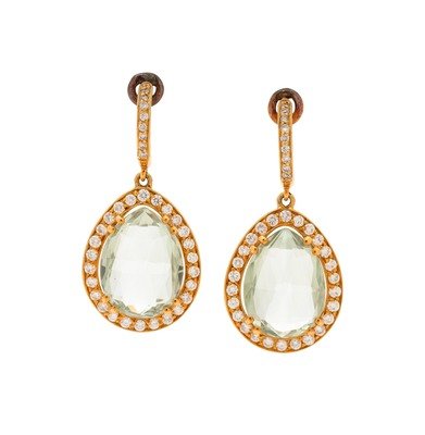 Containing two pear shape mixed cut green quartz drops measuring approximately 15.00 x 11.00 mm and 70 round brilliant cut diamonds.