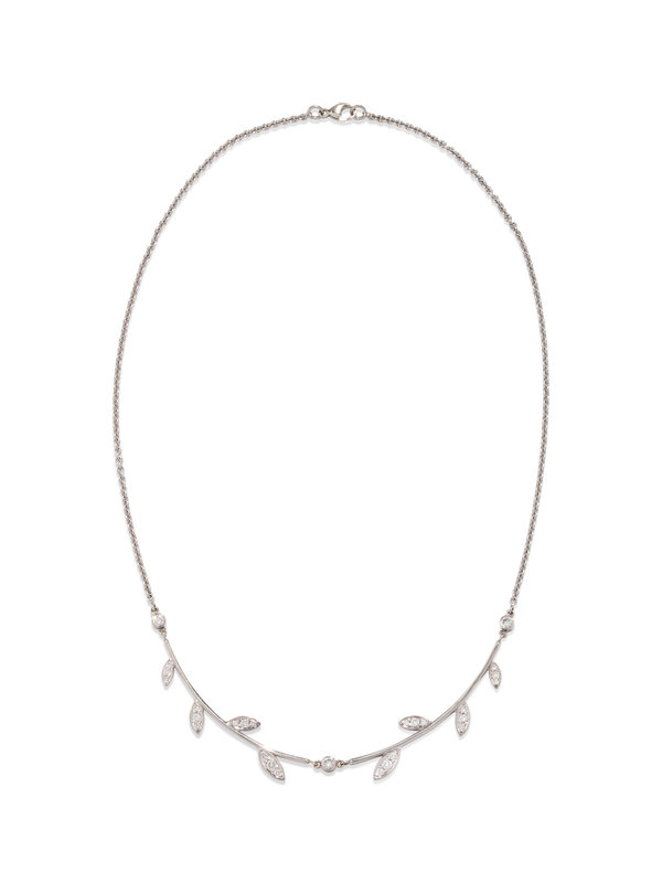 Consisting of curved branch motif links and connector links containing 27 round brilliant cut diamonds weighing approximately 0.55 carat total, suspended from cable link chain.