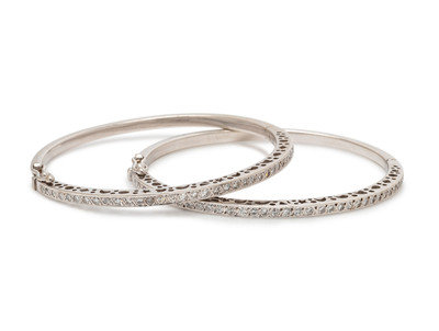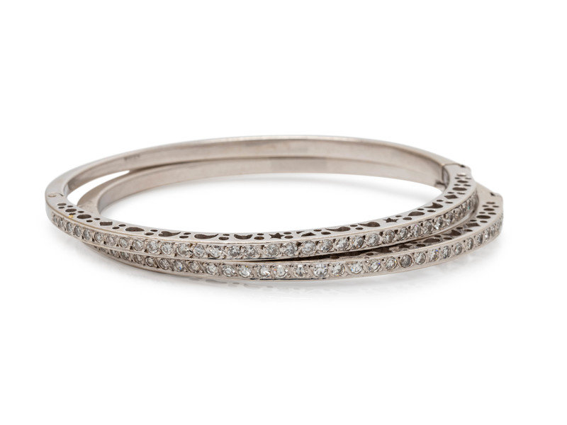 Consisting of two bangles containing 72 single cut diamonds weighing approximately 1.25 carats total. Mounted in white gold.