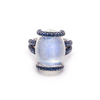 Containing one oval shape cabochon cut moonstone measuring approximately 20.20 x 15.10 x 9.80 mm and numerous round mixed cut sapphires. Mounted in white gold.
