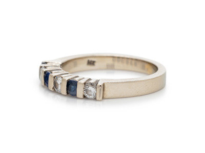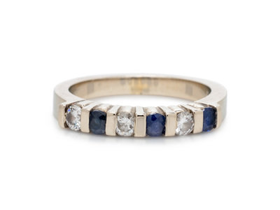 Containing three round mixed cut sapphires measuring approximately 2.50 mm in diameter and three round brilliant cut diamonds weighing approximately 0.15 carat total. Mounted in white gold.