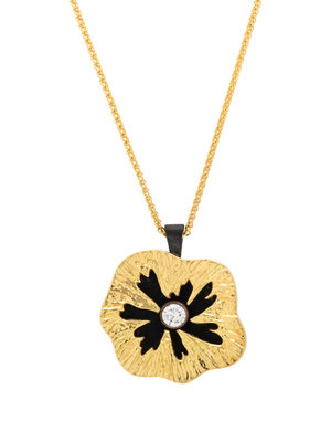 Consisting of a stylized sea urchin pendant with textured yellow gold overlaid on a blackened cobalt chrome back containing one round brilliant cut diamond weighing approximately 0.15 carat, suspended from a wheat chain necklace.