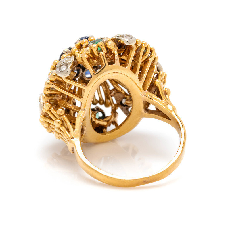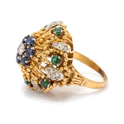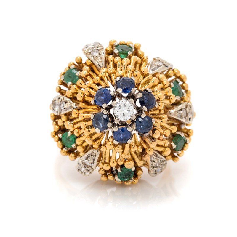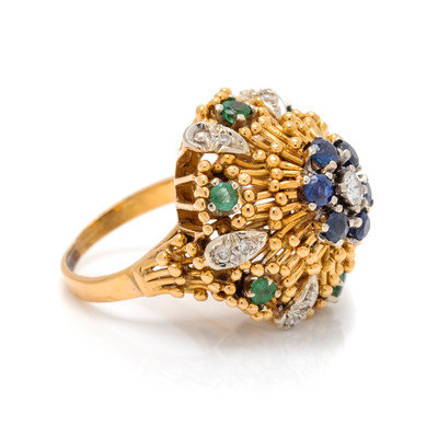 YELLOW GOLD, DIAMOND, SAPPHIRE AND EMERALD RING
