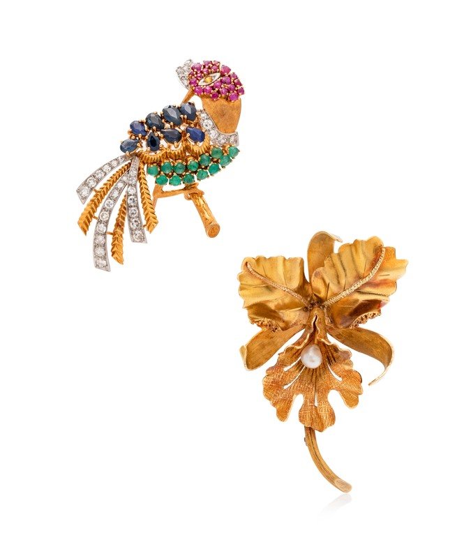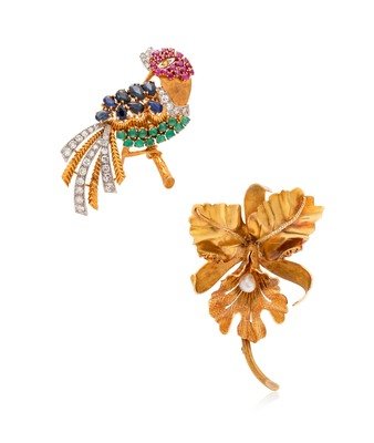 Consisting of an orchid pendant/brooch containing one cultured pearl, together with a platinum and yellow gold bird brooch containing 34 round brilliant cut diamonds weighing approximately 1.00 carat total, eight pear shape mixed cut sapphires, 13 round cabochon cut emeralds, 20 round mixed cut rubies and one yellow gemstone eye.
