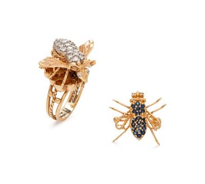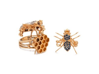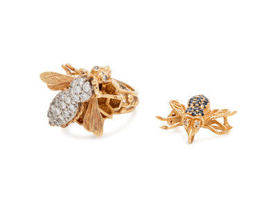 Consisting of a yellow gold ring with a bicolor gold attached bee brooch containing 22 round brilliant and single cut diamonds weighing approximately 0.45 carat total, together with a bee pendant/brooch containing 20 round mixed cut sapphires measuring approximately 1.50 mm in diameter.