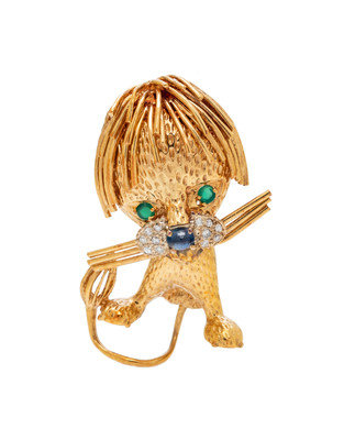 YELLOW GOLD, DIAMOND, EMERALD AND SAPPHIRE LION BROOCH