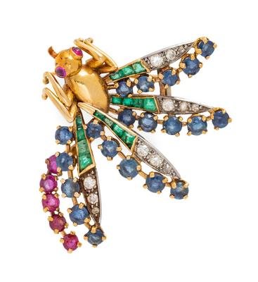 Containing 12 round brilliant and single cut diamonds, 20 round mixed cut sapphires, 15 step cut emeralds, five round mixed cut rubies and two round cabochon cut ruby eyes.