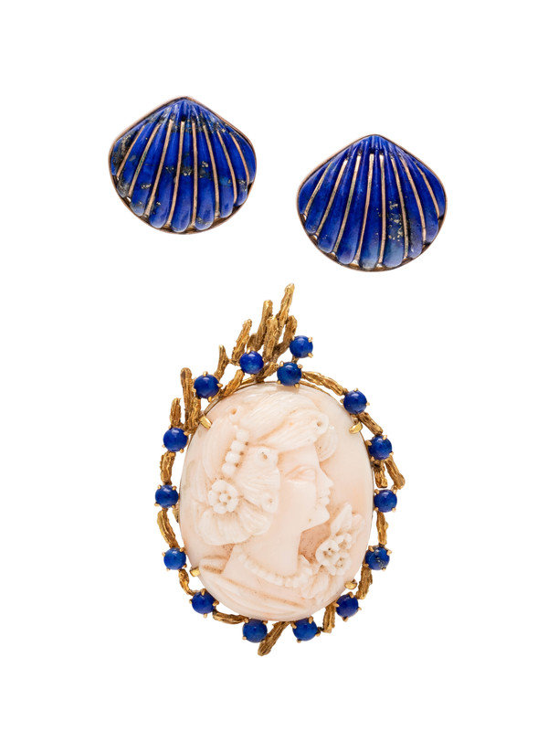 Consisting of a brooch containing one oval shape carved coral depicting the profile of a woman and 15 round cabochon cut lapis lazuli, together with a pair of earrings containing carved shell motif lapis lazuli.