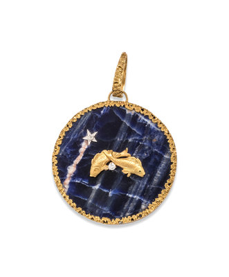 Consisting of a round sodalite disc with textured gold surround, surmounted with yellow gold fish containing one round brilliant cut diamond weighing approximately 0.10 carat and a white gold star containing one mixed cut diamond.