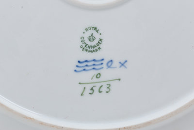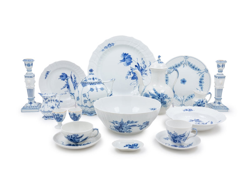 largely comprised of items in the Blue Flowers pattern by Royal Copenhagen, including: 8 dinner plates; 10 salad plates; 9 bread plates; 12 soup bowls; 8 teacups and 7 saucers; 6 coffee cups and 4 saucers; a circular serving dish; a center bowl; a serving bowl; a butter dish; 4 butter pads; 2 leaf-form serving dishes; a teapot; a creamer; a sugar and underplate; 2 egg cups and 2 candlesticks, together with items in the Blue Fluted pattern by Royal Copenhagen, including a teapot, a creamer and 2 salad plates; further including various items by Bing & Grondahl, including 12 dinner plates; 12 salad plates; 2 teacups and 2 saucers; 114 items total.