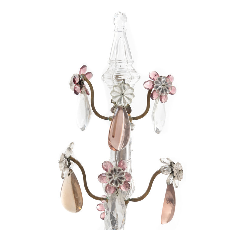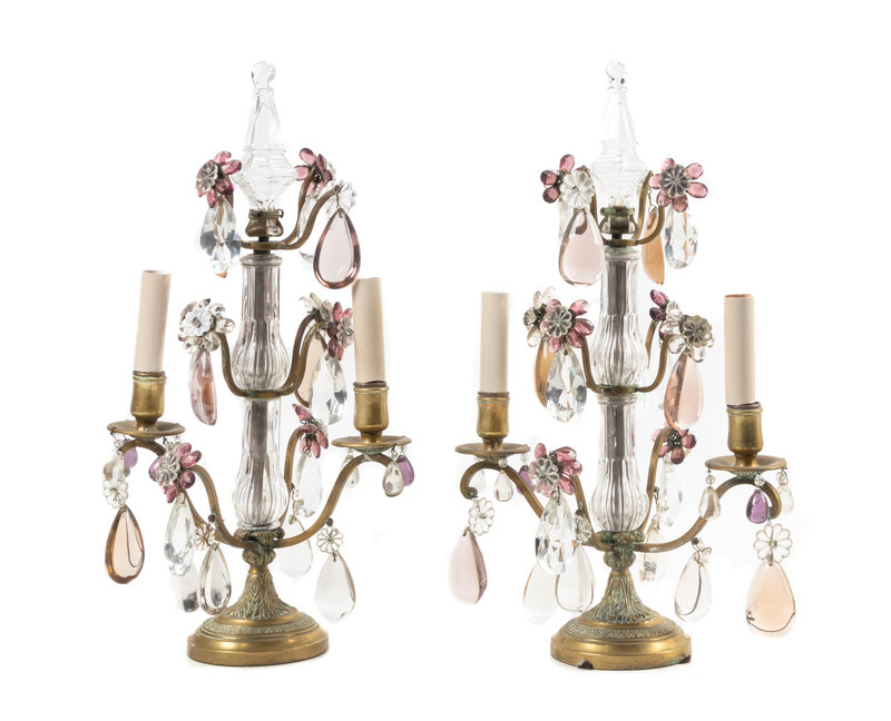 A Pair of Continental Brass and Glass Two-Light Candelabra