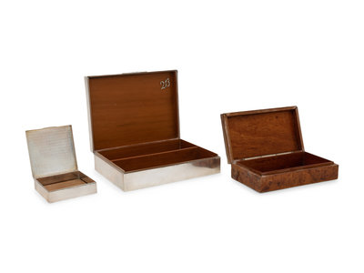 comprising a Portuguese cigar box; a Continental silver-mounted cigar box; an American silver cigarette box and 12 silver-mounted cut glass ash trays by Gorham.