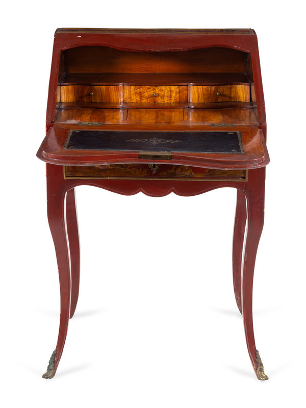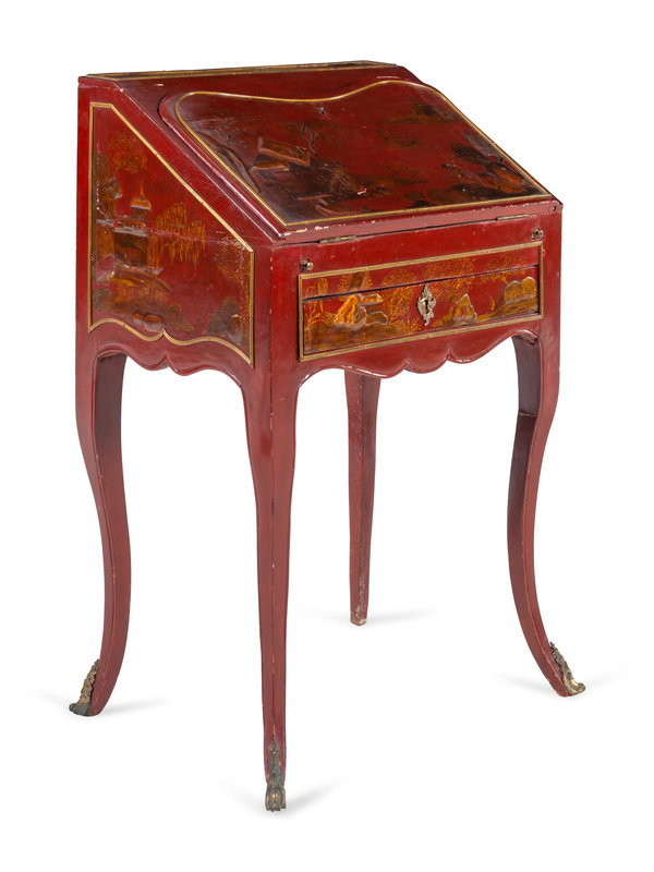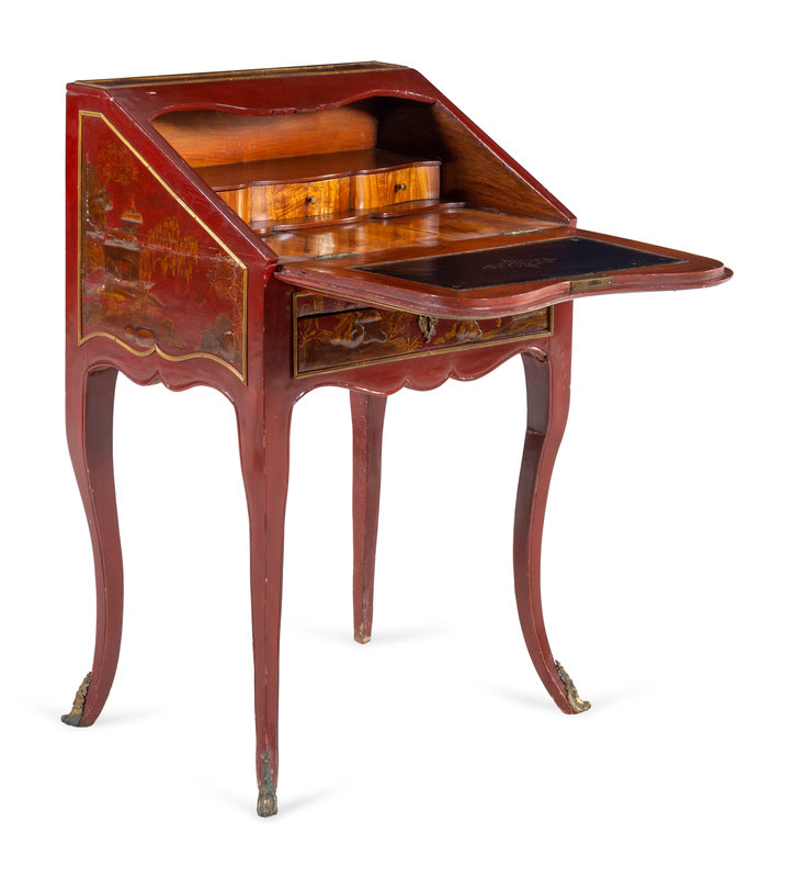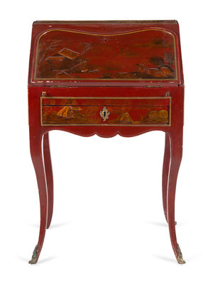 A Louis XV Red Chinoiserie Lacquered Slant-Front Bureau