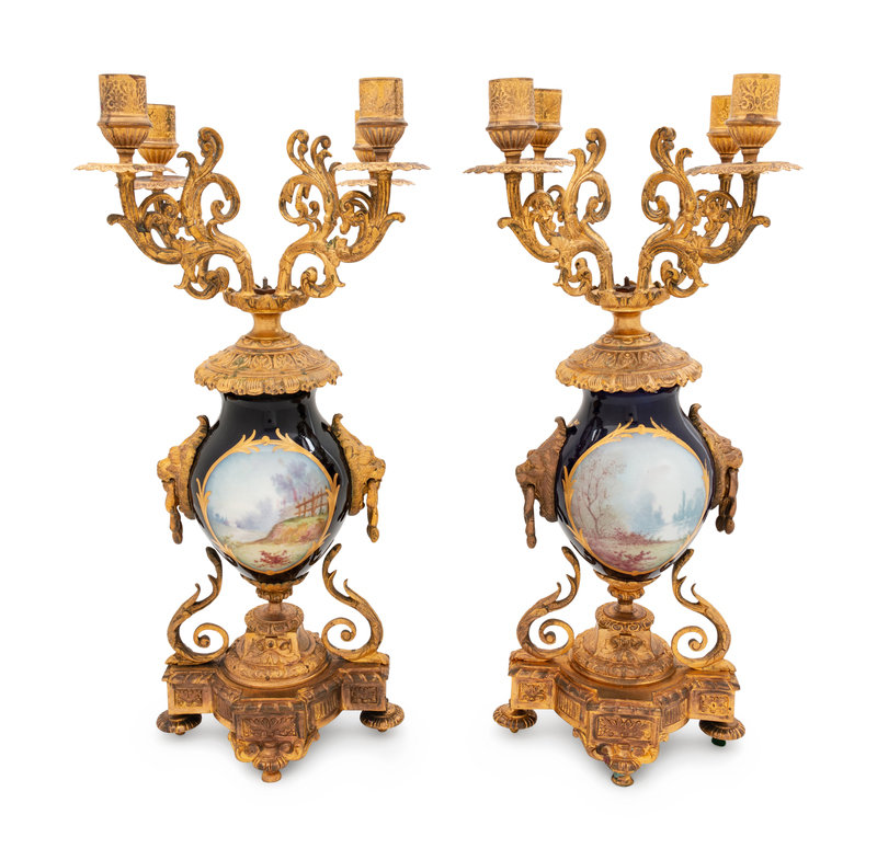 A Pair of Gilt Metal Mounted Sèvres Style Four-Light Candelabra