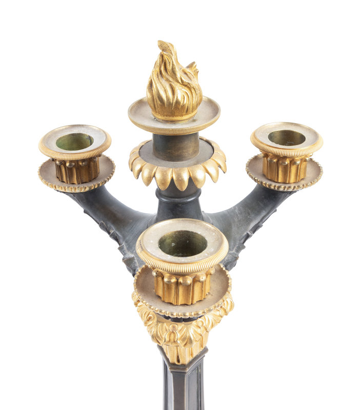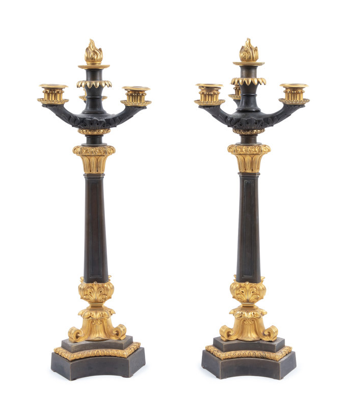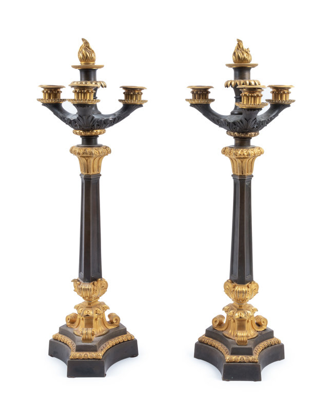 A Pair of Charles X Style Gilt and Patinated Bronze Four-Light Candelabra