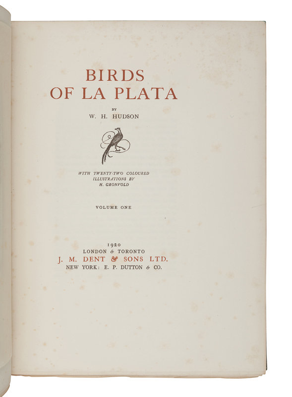 HUDSON, William Henry (1841-1922). The Birds of La Plata. London, Toronto, and New York: J.M. Dent & Sons and E.P. Dutton & Co., 1920.