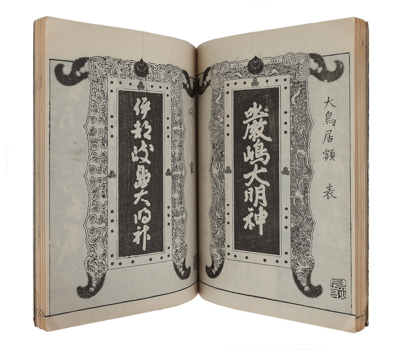 Woodcuts of devotional gift-giving, including a fine illustration of a falcon, and a double-page woodcut of Itsukushima Shrine with its distinctive "floating" torii gate.