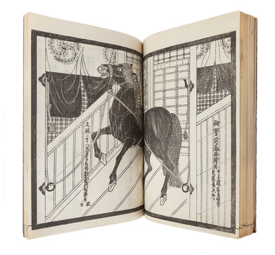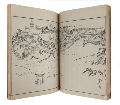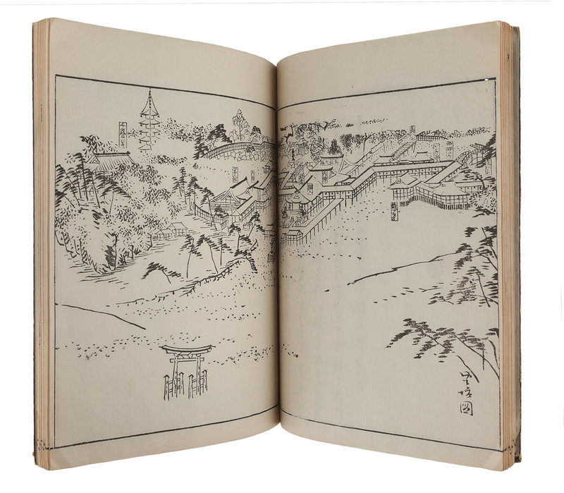 [JAPANESE BOOKS]. CHITOSĒN Fujihiko (千歳園 藤彦, possibly Senzaien Fujihiko, active 19th c.) -- WATANABE Taigaku (渡辺 対岳, active 19th century), illustrator. 厳島絵馬鑒 Itsukushima Ema Kagami [The Ex-votos of Itskushima Shrine]. [Hiroshima]: 1833 (Tenpō 3).