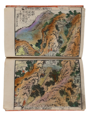 2 volumes (of 75 comprising volume 3 part 6 and volume 8 part 3 only), 4to. 8 woodblock illustrations by Katsushika, 6 hand-colored. Publisher’s original embossed paper, stab-sewn (some soiling and creasing, extremities rubbed, minor chipping to title label).