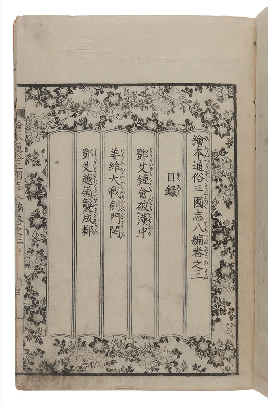 [JAPANESE BOOKS]. LUO Guanzhong (羅貫中, Luo Ben 羅本, ca 1330-1400 or ca 1280-1360) -- KATSUSHIKA Taito (葛飾戴斗, active ca 1810-1853), illustrator. -- IKEDA, Tōri (池田 東籬, 1788-1857), translator. 繪本通俗三国志 Ehon tsūzoku Sangokushi [Illustrated Romance of the Three Kingdoms]. [Osaka]: [Gungyokudō], [1836- 1841 (Tenpō 6-11)].