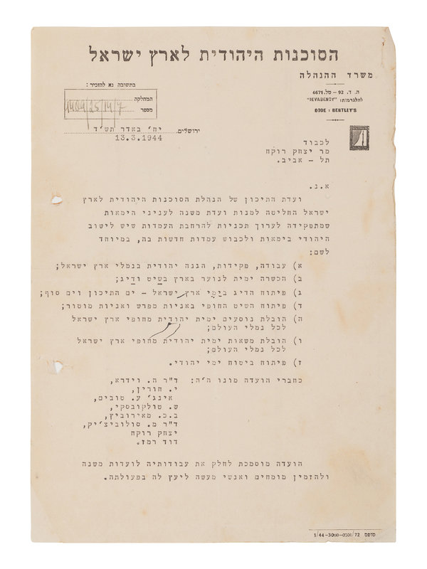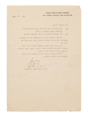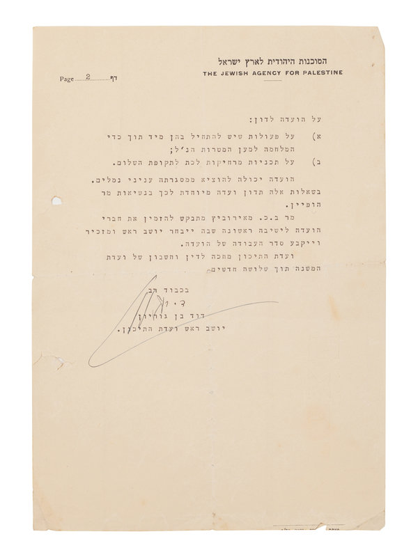 [JUDAICA]. -- BEN-GURION, David (1886-1973). Typed document signed (''David Ben-Gurion''), as Chairman the executive committee of the Jewish Agency for Palestine, in Hebrew. Tel Aviv, 13 March 1944. 2 pages, 4to, on Jewish Agency for Palestine stationery, some minor staining or marginal chipping.