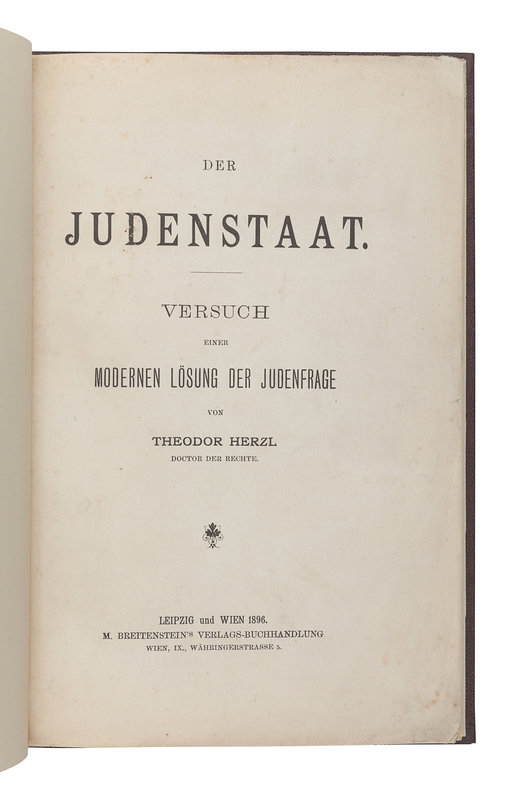 [JUDAICA]. -- HERZL, Theodor (1860-1904). Der Judenstaat. Versuch einer moernen Lösung der Judenfrage. Leipzig and Vienna: M Breitenstein, 1896.