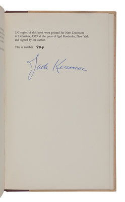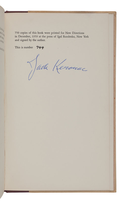 8vo. Original purple cloth-backed boards (lacking acetate dust jacket, slight soiling); cloth folding case. LIMITED EDITION, number 744 of 750 copies SIGNED BY KEROUAC. Visions of Cody recounted Kerouac’s travels with Neal Cassidy in the 1940s, and was not published in its entirety until 1972, after Kerouac’s death.