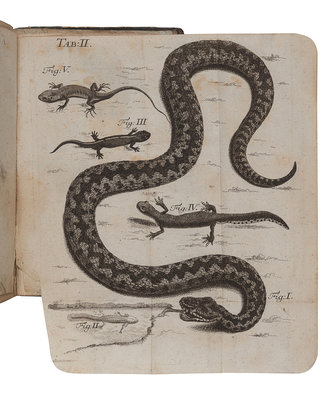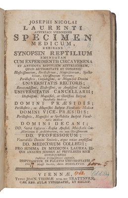 LAURENTI, Joseph Nicolai (1735-1805). Specimen Medicum, exhibens Synopsin Reptilium Emendatam cum Experimentis circa Venena et Antidota Reptilium Austriacorum. Vienna: Joan. Thomae, [1768].