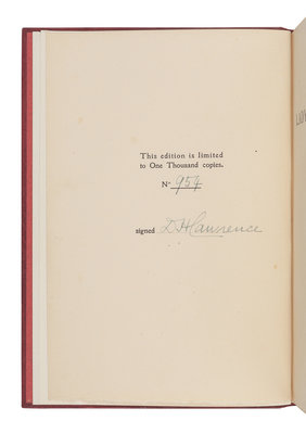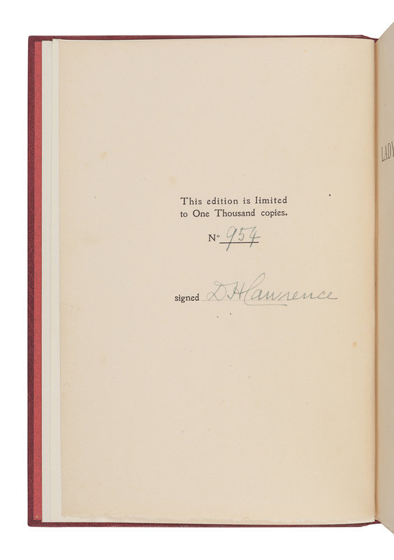 FIRST EDITION, LIMITED ISSUE, number 954 of 1000 copies signed by Lawrence. Lawrence commissioned the Tipografia Guintina in Florence to print Lady Chatterley's Lover in the spring of 1928 after it was rejected by several English publishers. He planned to sell the one thousand numbered copies for £2 each and sent order forms to friends in America and Europe who acted as agents in distributing copies. By December 1928, Lawrence had nearly sold all one thousand copies despite the fact that the novel was about to be suppressed in London and was stopped from entering the United States. Roberts A42a.