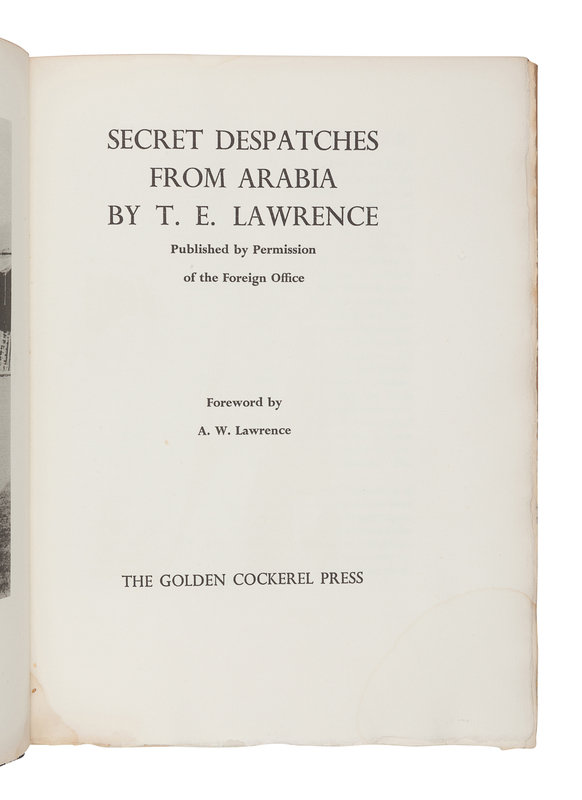 LAWRENCE, T. E. (1888-1935). Secret Despatches from Arabia. Edited by A. W. Lawrence. [Waltham St. Lawrence, Berkshire:] The Golden Cockerel Press, 1939.