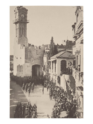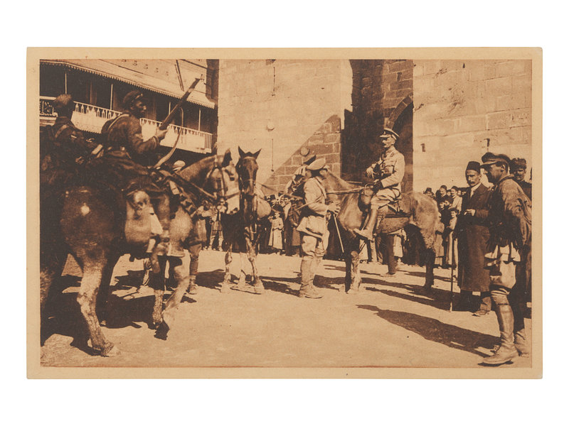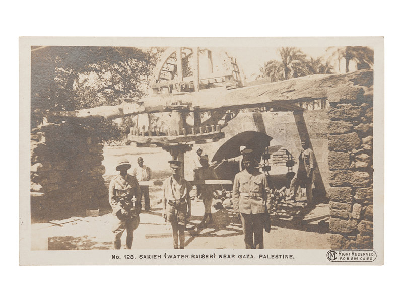 [With:] A vintage photograph of British troops entering Jaffa Gate, Jerusalem, 11 December 1917; and 2 related postcards: First Entrance of General Watson at Jaffa Gate, Jerusalem; and No. 128 Sakieh (water-raiser) near Gaza, Palestine.