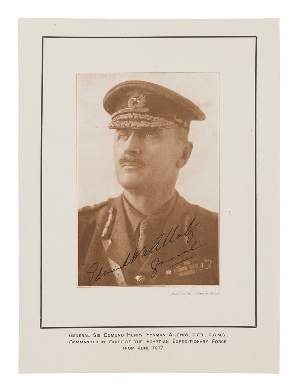 [LAWRENCE, T. E.] -- ALLENBY, Edmund Henry Hynman, 1st Viscount Allenby of Megiddo (1861-1936). Photographic print portrait of Allenby in his military uniform, photo by H. Walter Barnett, signed “Edmund H. Allenby / General”. [N.d., ca 1917]. With caption Commander in Chief of the Egyptian Expeditionary Force from June 1917.