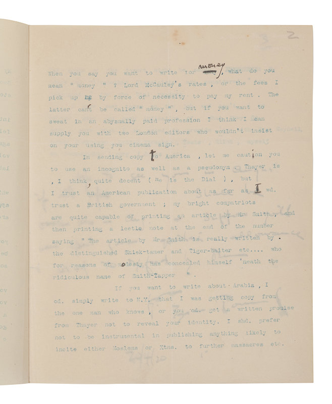Lawrence, evidently concerned about revealing his identity in his writings, is given advice by Pound: "... I don't care a saffron .... whether you use your own name or not; only if you don't you will be under the shameful and ignominious necessity of writing something which will interest the editor. Can you 'write'? Of course, having vortex'd a large section of Arabia you are fed up with vortices; but why reprove me, who have merely created a market for one or two artists and got a half dozen good books into print despite John Murray, Sr. G. Macmillan e questa puttazaia?... In sending copy to America, let me caution you to use an incognito as well as a pseudonym. [Scofield] Thayer is, I think, quite decent (He is the Dial), but I trust an American publication about as far as I wd. trust a British government; my bright compatriots are quite capable of printing an article by Mr Smith, and then printing a leetle note at the end of the number saying 'The article by Mr Smith is really written by a distinguished Shiek-tamer and Tiger-baiter etc.... Who for reasons of modesty has concealed himself 'neath the ridiculous name of Smith-Yapper. If you want to write about Arabia, I cd. simply write to N.Y. that I was getting copy from the one man who knows, or you cd. get a written promise from Thayer not to reveal your identity. I shd. prefer not to be instrumental in publishing anything likely to incite either Moslems or Xtns. to further massacres etc." Pound further cautions Lawrence against the hope that his writing will bring him much money. Published in Letters to T.E. Lawrence.
