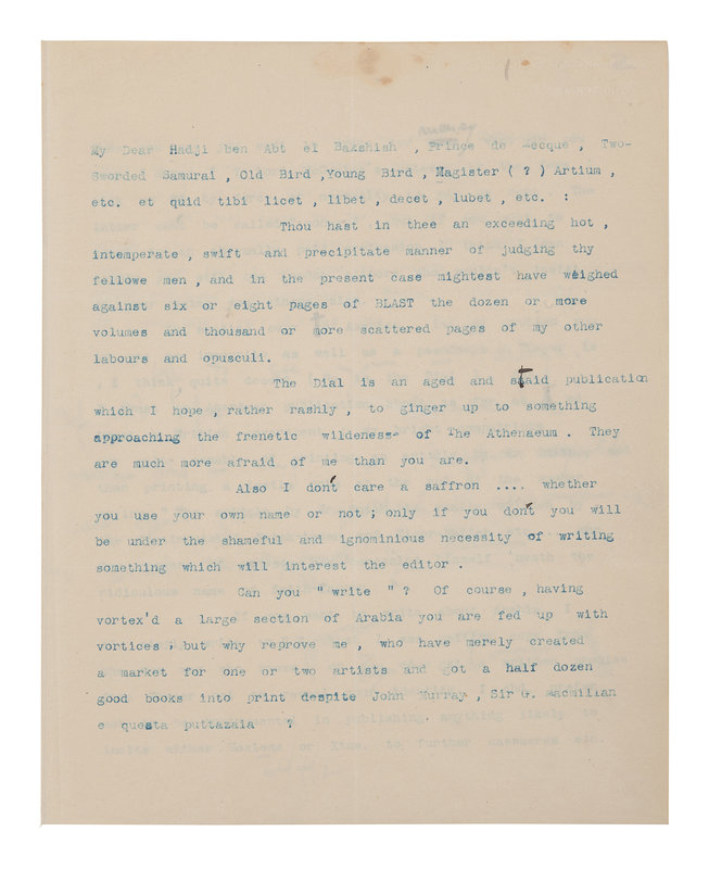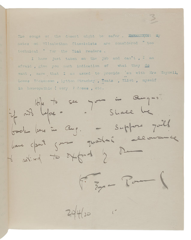 [LAWRENCE, T. E.]. --POUND, Ezra (1885-1972). Typed letter signed ("Ezra Pound") with five-line autograph postscript and emendations in text, to T.E. Lawrence ("My Dear Hadji ben Abt el Bakshish, Prince de Mecque, Two-Sworded Samurai, Old Bird, Young Bird, Magister Artium, etc."), 5 Holland Place Chambers, Kensington, 20 April 1920. 3 pages, 4to. Provenance: Sotheby’s, 20 July 1981, lot 262, purchased by Harry Spiro; Spiro Family Collection, sold Christie’s New York, 26 Feb 2004, lot 73.