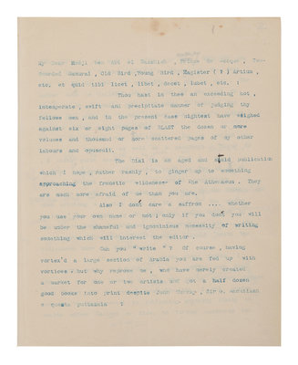 An exceptional response from Pound to Lawrence, who had solicited advice about publishing. "Thou hast in thee an exceeding hot, intemperate, swift and precipitate manner of judging thy fellowe men, and in the present case mightest have weighed against six or eight pages of BLAST the dozen or more volumes and thousand or more scattered pages of my other labours and opusculi." Pound had just been appointed correspondent to the Dial, which he describes as "an aged and staid publication which I hope, rather rashly, to ginger up to something approaching the frenetic wildenesse of The Athenaeum. They are much more afraid of me than you are."