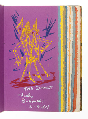 LIMITED EDITION, one of 777 unnumbered copies, SIGNED AND WITH AN ORIGINAL DRAWING BY BUKOWSKI in blue and red ink and yellow paint, signed, dated 2-9-64, and with title “The Dance” in silver ink.
