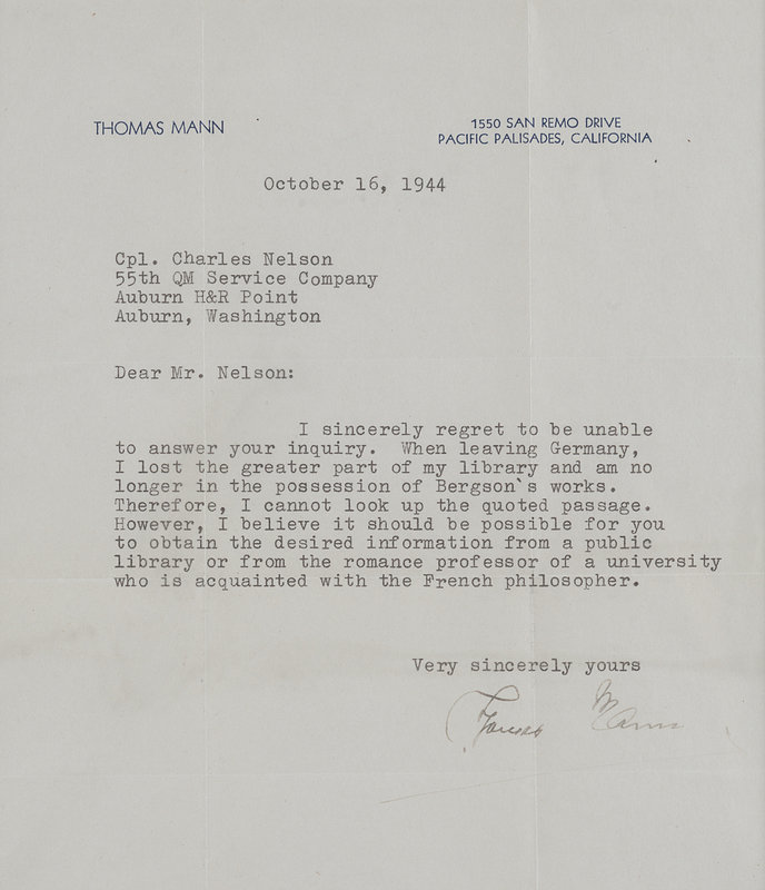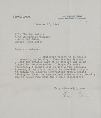 Mann responds to his correspondent's request: "I sincerely regret to be unable to answer your inquiry. When leaving Germany, I lost the greater part of my library and am no longer in the possession of Bergson's works. Therefore, I cannot look up the quoted passage." When Adolf Hitler came to power in 1933, Mann fled to Switzerland, and when war broke out in 1939, he moved to the United States. The Manns were prominent members of the German expatriate community in California, and Mann became a naturalized United States citizen on 23 June 1944.