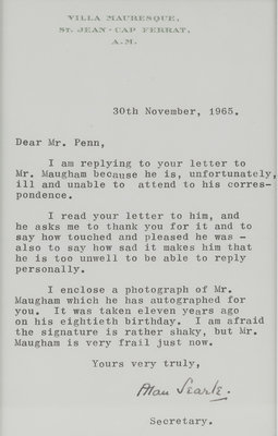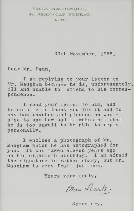 Writing on behalf of Maugham, his private secretary and companion Alan Searle responds: “I read your letter to him, and he asks me to thank you for it and to say how touched and pleased he was – also to say how sad It makes him that he is too unwell to be able to reply personally. I enclose a photograph of Mr. Maugham which he has autographed for you. It was taken eleven years ago on his eightieth birthday. I am afraid the signature is rather shaky, but Mr. Maugham is very frail just now.” Maugham would pass away just 16 days later.