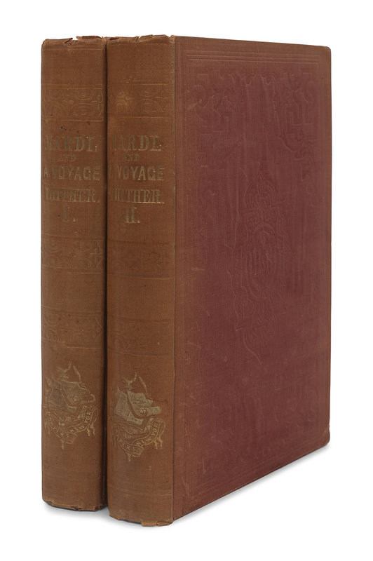 2 volumes, 8vo. (Some pale spotting). Original publisher’s rose blind-stamped cloth, gilt-lettered on spine, yellow coated endpapers (spines sunned, minor losses to spine ends vol. I, 1 1/2-in split to upper joint vol. I, corners slightly bumped, some soiling to endpapers as often); half morocco folding case. Provenance: John Sedgwick (early signature on titles, bookplates).