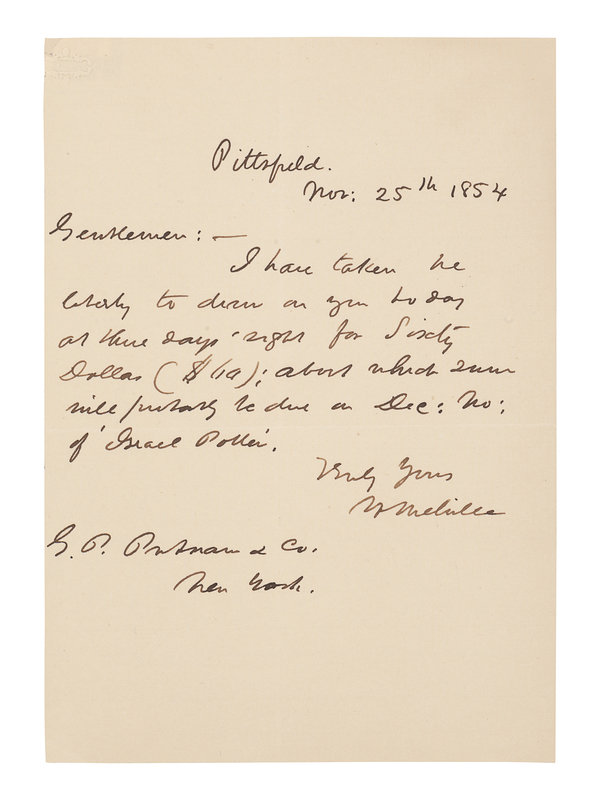 In full: “Gentlemen: — I have taken the liberty to draw on you today at three days’ sight for Sixty Dollars ($60); about which sum will probably be due on Dec: No: of ‘Israel Potter’.”