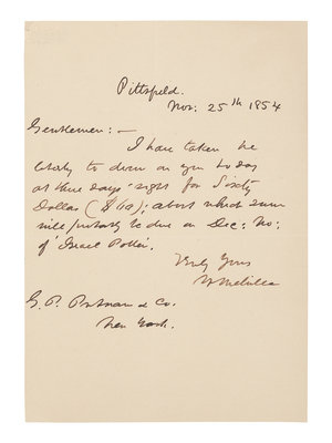 MELVILLE, Herman (1819-1891). Autograph letter signed ("H. Melville”), to his publisher George P. Putnam. Pittsfield [MA], 25 November 1854. One page, 8vo (171 x 121 mm). (Tiny chip at upper left corner repaired, otherwise fine.)