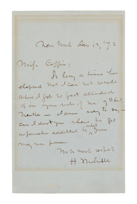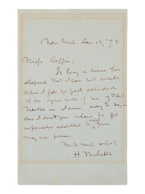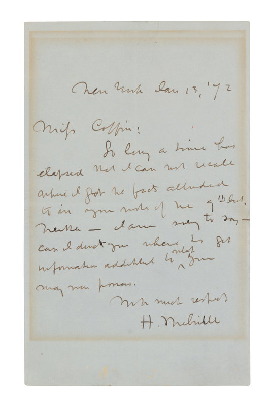 MELVILLE, Herman (1819-1891). Autograph letter signed ("H. Melville"), to Miss Coffin. New York, 13 January 1872. One page, 8vo (202 x 126 mm). Creased, marginal toning from old framing, a few small stains to lower margin. Provenance: Richard Manney Library (sold, Sotheby’s New York, 11 October 1991, lot 227).