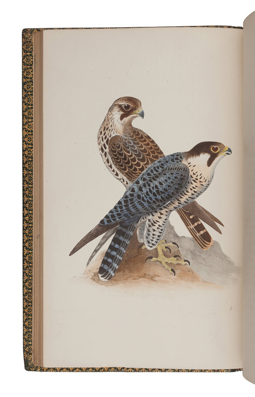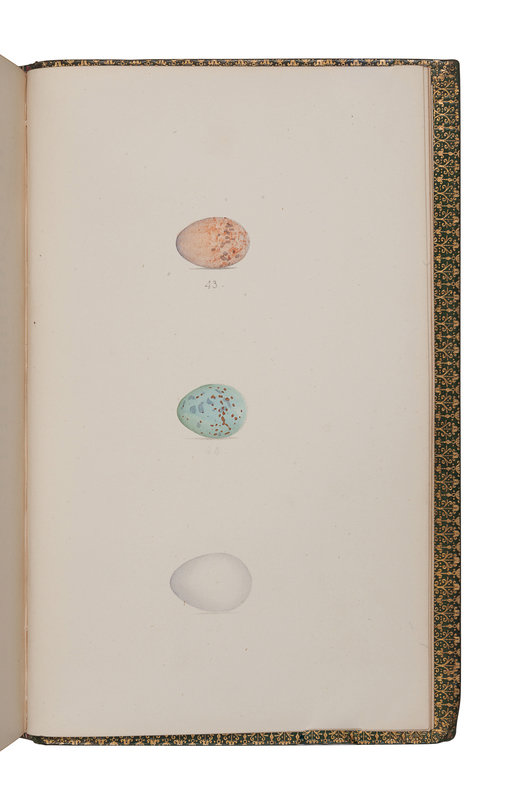 7 volumes, 8vo (217 x 133 mm). Wood-engraved title vignettes, 322 hand-colored lithographed plates of birds and 105 of their eggs, with 7 (of 8?) uncolored diagram plates. (Occasional spotting). Contemporary green morocco gilt, spines in 6 compartments with 5 raised bands, gilt-lettered in 2, the rest gilt-decorated, edges gilt (spines slightly sunned with a few minor scuffs, a few discreet repairs to some edges and spine ends).