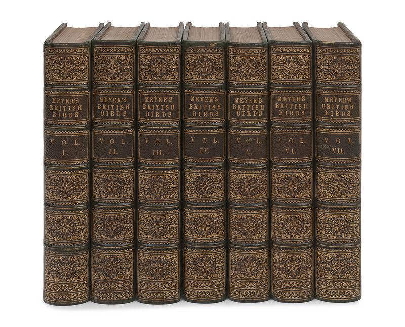 Mixed octavo edition uniformly bound of Meyer's work on British birds. With illustrations after Meyer and his wife Mary Ann Moor Meyer, notably including the eggs of most species listed, an uncommon addition for ornithological works of the day.