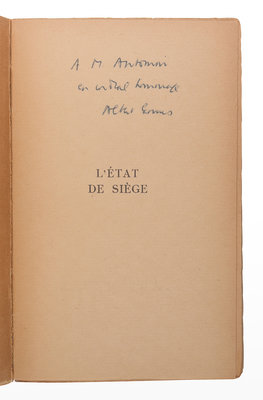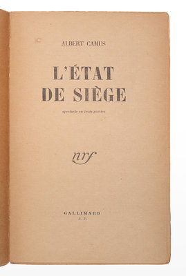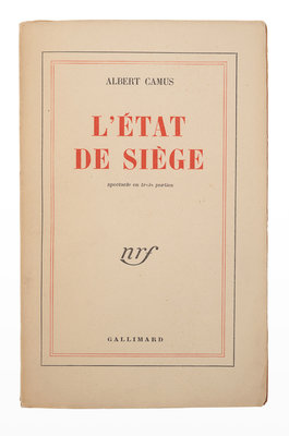 FIRST EDITION, PRESENTATION COPY, INSCRIBED BY CAMUS on half-title: “A. M. Antomin en cordial hommage Albert Camus.” Critics and the public expected a dramatization of Camus’ La Peste (1947), but L'État de siege was different in tone, and was initially poorly received. Despite this, the work has remained almost constantly in print in French since its first publication.