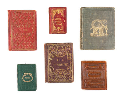 WILLIAMS, C. Child’s Natural History of Beasts. New Haven: Durrie and Peck; Philadelphia: Smith and Peck, n.d. Original pictorial light green cloth gilt. Provenance: R. E. Wyarts (signature, 1846). -- CARTER, S. C. The Offering. Boston: G. W. Cottrell, 1852. Original maroon blind-stamped cloth gilt. -- LILL, Cousin. The Songs of the Seasons. Boston: G. W. Cottrell, 1855. Original blind-stamped red cloth gilt. Provenance: Mary J. James (gift inscription, 1863). -- Demorest’s Gem Souvenir. [New York: Demorest, ca 1870]. 19th-century leather. -- The Diamond Etiquette for Courtship and Marriage. London: G. E. Petter, n.d. Original red cloth gilt. -- Pearls. Boston: American Tract Society, n.d. Original green blind-stamped cloth gilt. -- VIZCAYNO, Sebastian. Jornada Principal de las Californias. (Accidentes Documentados). Mexico, D. F: G. M. Echaniz, 1963. Modern red morocco gilt. LIMITED EDITION, printed for Dawson’s Book Shop. -- GONZÁLEZ PEÑA, Carlos. La Vida y la Obra de Altamirano. Mexico: G. M. Echaniz, 1964. Modern red morocco gilt. -- Together, 8 works in 8 volumes, various 48mo and 64mo sizes or smaller, condition generally good.