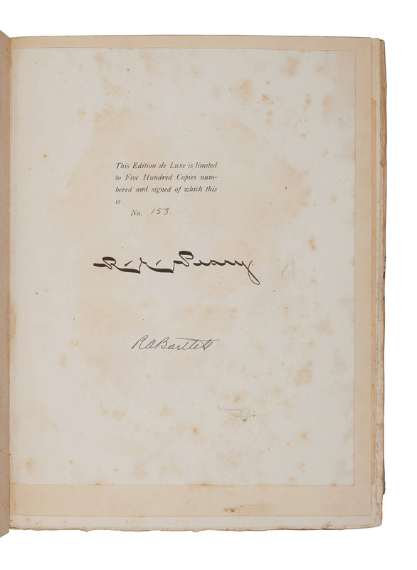 FIRST EDITION, LIMITED DELUXE ISSUE, number 153 of 500 copies signed by Peary and R. A. Bartlett. Peary’s account of his achievement of the pole is introduced with high praise by Theodore Roosevelt. Peary wintered at Ellesmere Island before heading North to the pole with a small team. Despite winning a high profile lawsuit against Frederick Cook, who had a competing claim, recent scholarship has cast some doubt on Peary's ability to accurately measure his own location on the ice, having left Bartlett, his expert navigator, behind at the camp. Arctic Bib. 13230.