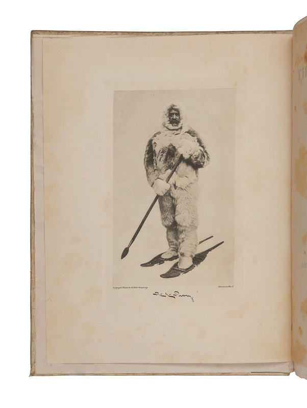 4to. 4 photogravure plates, 112 mounted photographic reproductions, folding map (some staining to map). (Title and frontispiece tissue guard foxed, some mostly marginal foxing throughout.) Original publisher’s vellum gilt, upper cover with gilt bust of Peary in profile, top edge gilt, others uncut, cloth ties (vellum very spotted, with some gilt rubbed away, endpaper wrinkled, edges foxed).