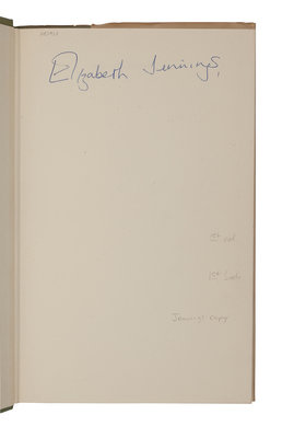 FIRST EDITION, THE POET ELIZABETH JENNINGS’ COPY with her signature. Jennings, who wrote in a traditional formalist style, was the only woman counted among the postwar Movement poets, including Philip Larkin, Kingsley Amis, John Wain and Thom Gun. Through Ted Hughes’ relationships on the fringe of The Movement, the two 20th century poets were acquainted, and both Plath and Jennings have been labeled as confessional poets due to their self-disclosing manner. A FINE ASSOCIATION COPY.