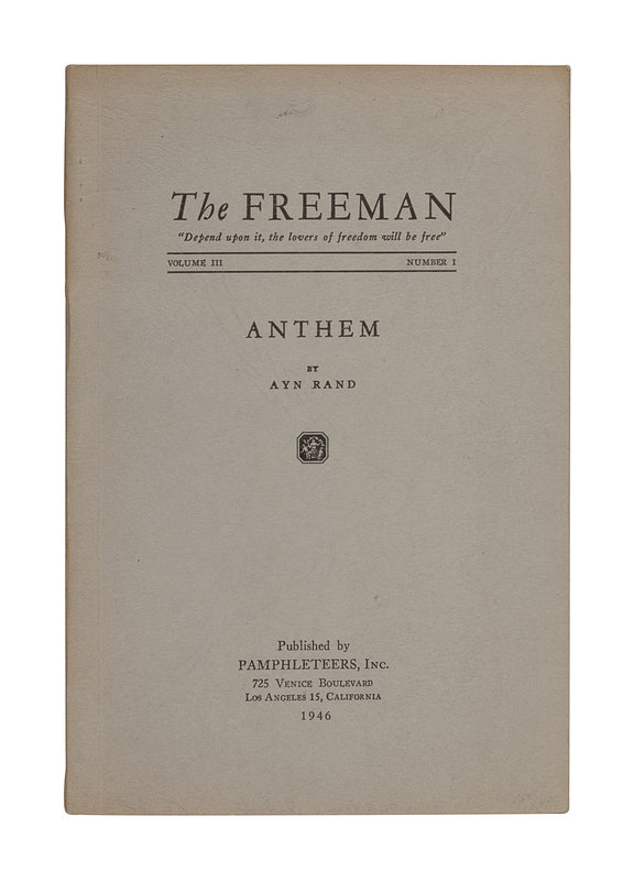 RAND, Ayn (1905-1982). “Anthem.” In: The Freeman. Vol. III, No. I. pp.[I]-[VIII], 1-98. Los Angeles: Pamphleteers, Inc. 1946.